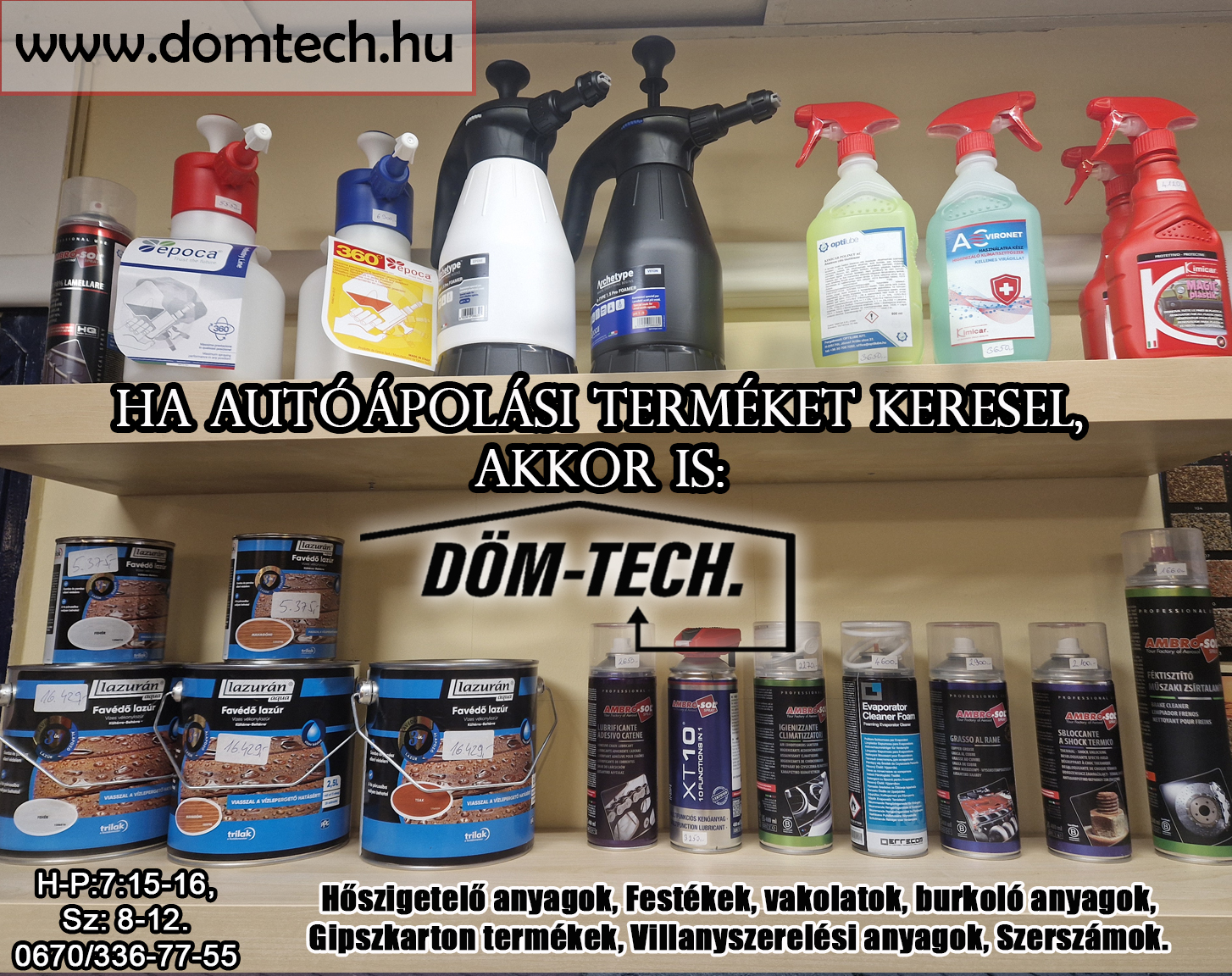 Hőszigetelő anyagok, festékek, vakolatok, burkoló anyagok, gipszkarton termékek, villanyszerelési anyagok, szerszámok és autóápolási termékek.